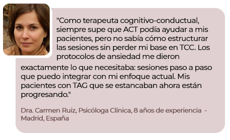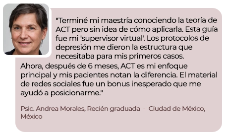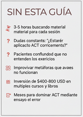Deja de improvisar en sesiones y aplica ACT con la misma seguridad de los terapeutas más experimentados, usando protocolos completos que generan resultados reales desde la primera sesión
